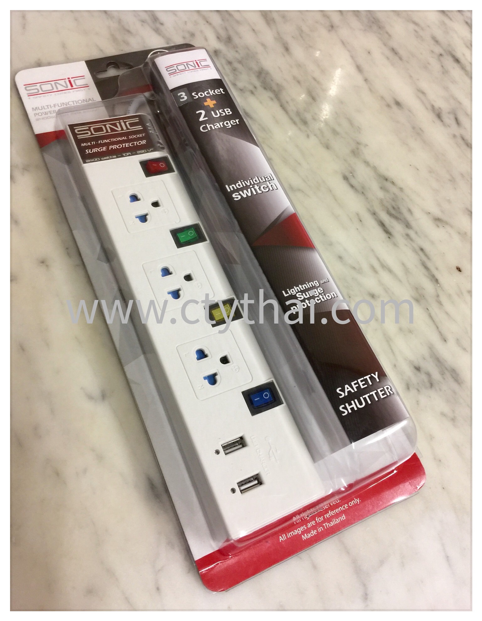 รางปลั๊กไฟ “Sonic” 3 ช่อง 3 สวิตซ์ พร้อมช่องเสียบ USB สายยาว 3 เมตร